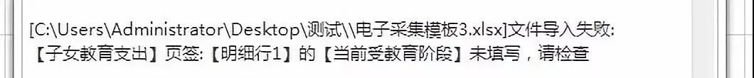电子模板中带“*”号栏次,是必填项。这些栏次一方面用于计算您截至目前可以享受的专项附加扣除总额;另一方面用于事后核验需要。如果您漏填了,导入扣缴端软件时,系统将给出“[XXX]文件导入失败,XX页签:XX项目未填写,请检查”的提示。